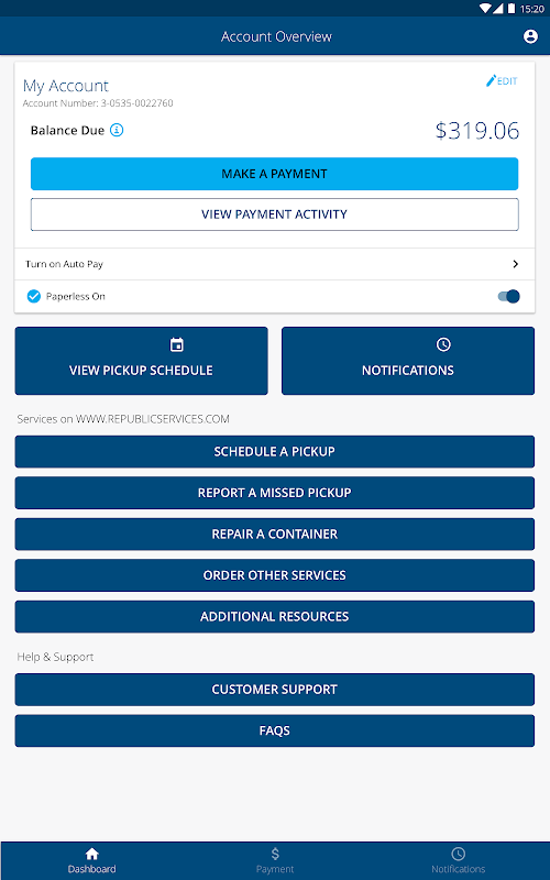 يتيح لك تطبيق Republic Services إدارة حساب Republic Services.