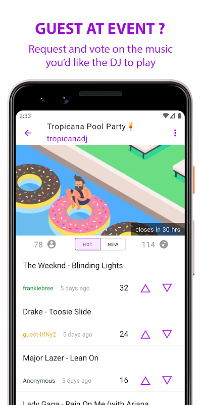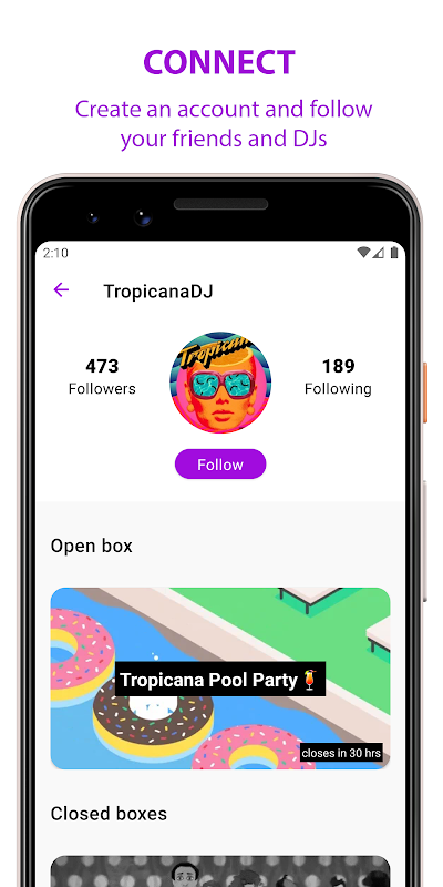 كضيف ، يمكنك التأثير على الموسيقى عن طريق إسقاط طلبات الأغاني أو عن طريق التصويت على طلبات الضيوف الآخرين. يمكنك أيضًا إنشاء حساب لمتابعة المضيفين / منسقي الموسيقى المفضلين لديك وتكون أول من يعلم عند إنشاء مربع جديد.