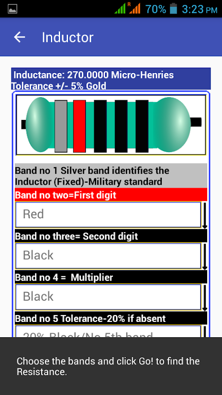 يتم تحديد coding.Resistors اللون باستخدام نطاقات الألوان القياسية على جسم المقاوم، المقاوم قد يكون 4 أو 5 فرق اعتمادا على الصانع، هذا التطبيق يساعدك على العثور على قيمة المقاومة من العصابات. هذا البرنامج متوافق مع معيار اللون الدولي الحالي هو IEC 60062. وبالمثل يتم وضع علامة المكثفات من الرموز على هيئته، والآن يمكنك بسهولة العثور على قيمة السعة على أساس حرف خفي. وتتميز أيضا لفائف أو الإختناقات في اللون مع الفرقة الفضية في قيادة (لتمييزها عن المقاوم) و 2 الأرقام تشير إلى القيمة والرقم الثالث المضاعف.
