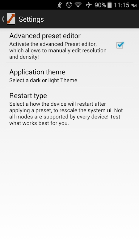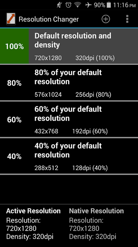 This app makes it easy to change the resolution of your screen in order to play games with more FPS, save the battery or to test your app with different resolution.