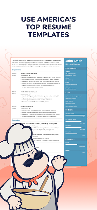 يتأكد ResumeChef من أن سيرتك الذاتية ستكون مثل طبق ذواقة مذهل. من المذهل النظر إليه، مما يجعلك ترغب في التعمق فيه على الفور ومليئًا بالجوهر. الاختلاف الرئيسي؟ أنا أستغرق وقتًا أقل بكثير لطهيها!