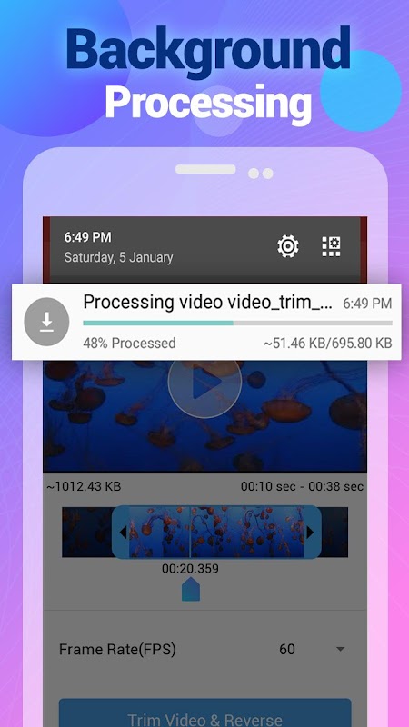 يمكنك اختيار فيديو من المعرض أو تسجيل فيديو جديد باستخدام Phone Camera. يمكنك عكس الفيديو بجودة HD مع يمكنك تحرير معدل الإطار (حتى 60 FPS) من الفيديو.