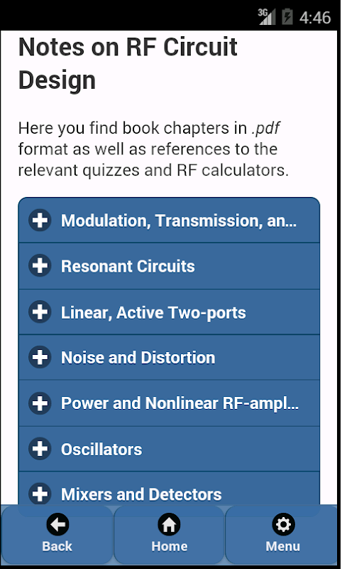 The App also contains short summaries on RF and microwave circuits as well as a free book on RF circuit design with the following chapters: