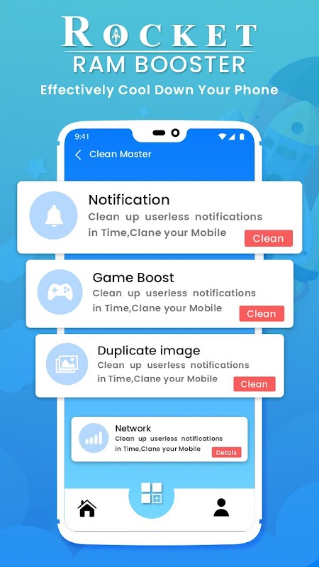 Ram Booster Master can end unused applications easily with just one tap, so it can release more memory space and make the phone run more smoothly and fast without slow! With a unique management engine, Rocket Booster App will shut down idle Rocket Booster App running in the background to extend your phone's battery life. Unemployed Rocket Booster App, can reduce the capacity of your memory and RAM, it can also slow down the performance of your phone. Rocket Cleaner can back up your unused applications, save and reinstall if you need them.