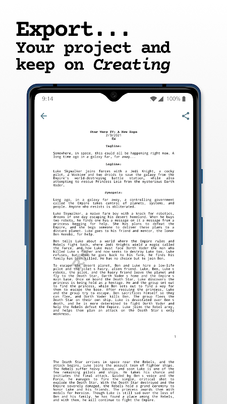 ✔️ Finally, generate a formatted PDF document containing your screenplay's outline and additional content.