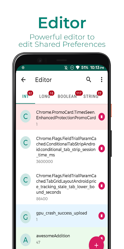 PrefEdit features a great looking, easy-to-use user interface, made with the latest and greatest offerings of Google's own Material Design library. It also features a AMOLED dark theme which can work in conjunction with system dark theme (on Android 9 and above).