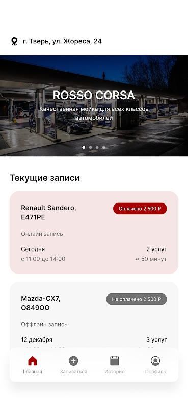 تم تصميم التطبيق للتسجيل المريح لسيارتك في ROSSO CORSA Car Wash في مدينة تفير على العنوان: st. Zhores 24. القدرة على اختيار وقت الفراغ في التاريخ المطلوب ، قائمة الخدمات والأسعار ، سياراتك ، برنامج الولاء.