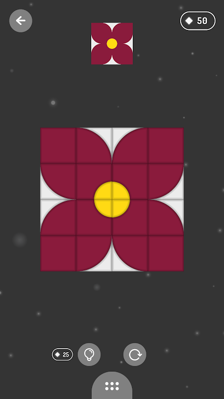 الهدف هو مطابقة القطع مع العمل الفني المُعطى. انقر على القطع الماسية الشكل لتدويرها بشكل فردي على محورها، ووضعها في المكان الصحيح، ثم حوّل القطع إلى عمل فني بلمسة أخيرة: مرر إصبعك على الشاشة واستمتع بالسحر!