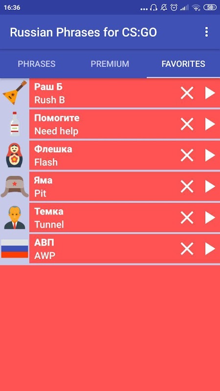 تتم ترجمة كل عبارة في لوحة الصوت إلى اللغة الإنجليزية ، لذلك لم تعد بحاجة إلى التساؤل عما يعنيه هؤلاء اللاعبون الروس عند استخدامهم العبارات الشائعة. تم اختيار هذه العبارات باعتبارها الأكثر استخدامًا في لعبة CS: GO من قبل اللاعبين الروس. الوصول بسرعة إلى العبارات الأكثر استخدامًا عن طريق إضافتها إلى قائمة المفضلة. فتح المزيد من التعبيرات المذهلة عن طريق شراء حزمة متميزة.