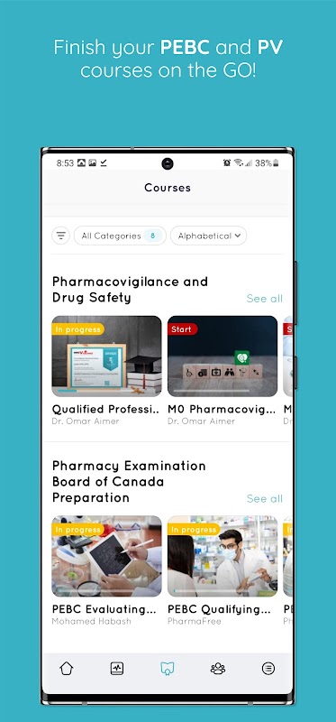منصة RxCourse عبارة عن منصة تعليمية اجتماعية عبر الإنترنت للصيادلة ؛ يمكّنك من التحضير لمجلس فحص الصيدلة في امتحانات PEBC الكندية ويساعدك على اكتساب موطئ قدم في صناعة المستحضرات الصيدلانية مثل سلامة الأدوية واليقظة الدوائية جنبًا إلى جنب مع دورات الرعاية الصحية الأخرى.