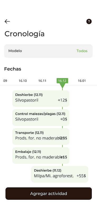 يساعد التطبيق المستخدم على إدارة النماذج الإنتاجية من خلال تتبع جميع الأحداث المخزنة في التطبيق، بما في ذلك الأنشطة المستقبلية، والتي يمكن تعيين تذكيرات وتنبيهات لها. يتلقى المستخدمون أيضًا أخبارًا وإشعارات من منظمتهم المحلية، مشروع SAbERES، بالإضافة إلى النشرة الإخبارية للمائدة المستديرة المتعلقة بالمناخ الزراعي، والتي تتضمن أنماط الطقس المتوقعة وتوصياتها.