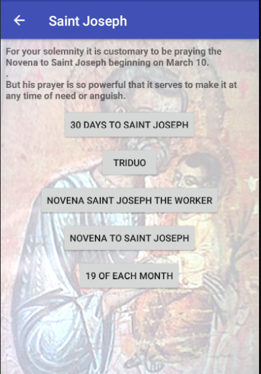 هذه مجموعة من الصلوات إلى القديس يوسف ، كل من الصلوات البسيطة ومسبحة novenas ، triduum والآلام والأفراح ، لتلبية الاحتياجات المختلفة من الحصول على وظيفة إلى الوالد الصالح ، مع أجهزة الإنذار لتحذير الأيام الخاصة للاحتفال أو الصلاة ، دون ومع ذلك ، فإنه ليس أقل اكتمالًا ، فقد يكون الترجمات خاطئًا لذا أقدر أي تصحيح أو طلب لإضافة أي جملة.
