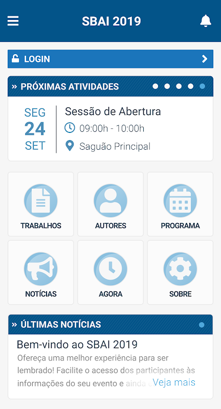 O aplicativo SBAI 2019 é gratuito e permite o acesso a todos os conteúdo do "14º Simpósio Brasileiro de Automação Inteligente", que acontecerá em Ouro Preto-MG durante os dias 27 a 30 de outubro de 2019.