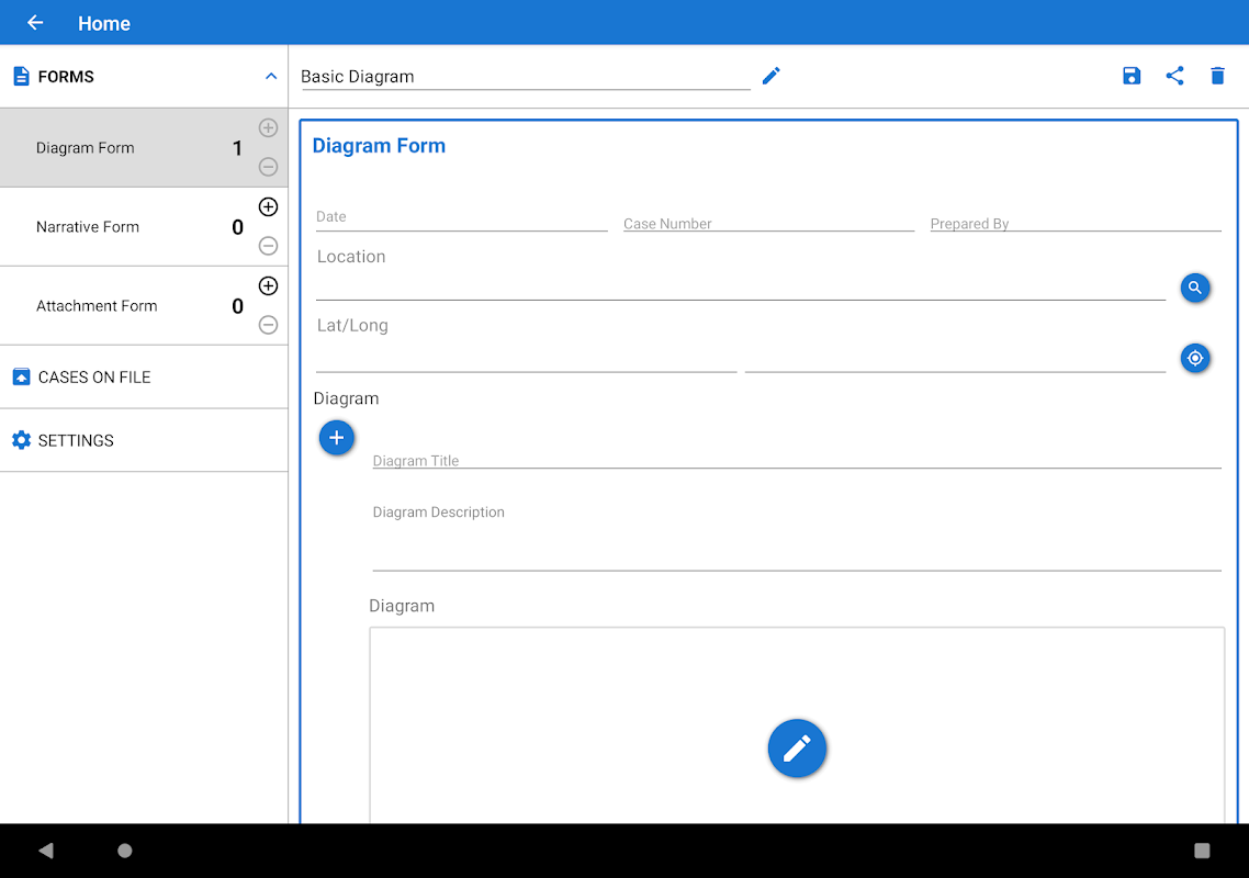 ScenePD Mobile is designed to assist in investigating and documenting traffic accidents and crime scenes. It provides a simple electronic form for recording incident details, tools for drawing diagrams of the incident including investigation specific symbols and the ability to draw structures with moveable walls, doors, and windows. Relevant photos can also be captured. Saved casebooks can be imported into ScenePD Pro for Windows for additional refinement, report generation, etc.