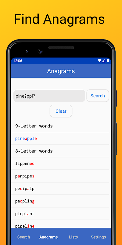 Dictionary tools for Scrabble: check words, find anagrams, make lists. Offline.