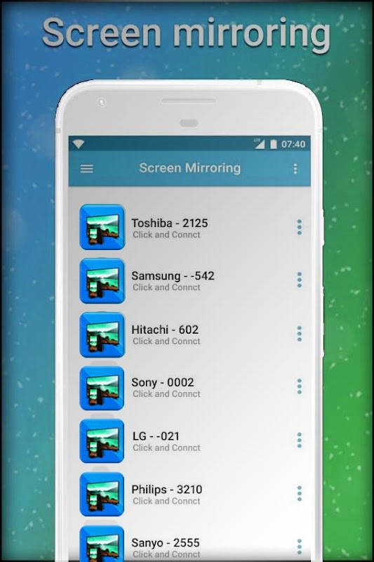 يمكن لنسخ الشاشة في تطبيق توصيل الهاتف بالتلفاز ربط الموبايل بالتلفزيون تشغيل المحتويات فقط ولكن إرسال الشاشة كما هو الحال في HDMI و MHL و Miracast و Chromecast. وقد تم اختبارها ووجدت أعمالا على معظم الهواتف المحمولة أندرويد.