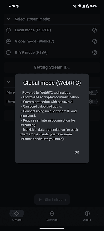 • عالمي (WebRTC): بث WebRTC عالمي مشفر من طرف إلى طرف مع كلمة مرور (فيديو + صوت).