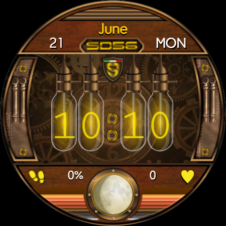 SD56 هو قرص رقمي لـ WearOS مقدم من SPEEDYDESIGN، وقد تم إنشاؤه بأسلوب STEAMPUNK مع الساعات المغلقة في مصباح قديم، بدون ألوان إضافية مثل الساعات الماضية، والتي بفضلها يمكنك التحكم في: