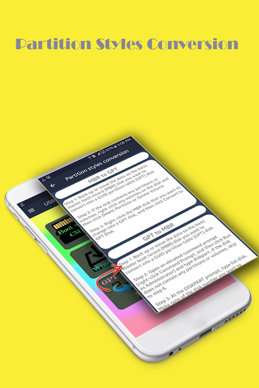SDCard/USB Boot Methods and Windows Installation app has the information of how to change MBR and GPT.