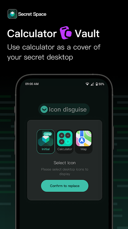 يعمل تطبيق Secret Space بشكل سري على جهازك، مع إمكانية تخصيص مظهره ليتوافق مع تطبيقاتك الأخرى. سواء اخترت مظهر "آلة حاسبة وهمية" أو رمزًا آخر، يضمن لك التطبيق حماية خصوصيتك دائمًا.