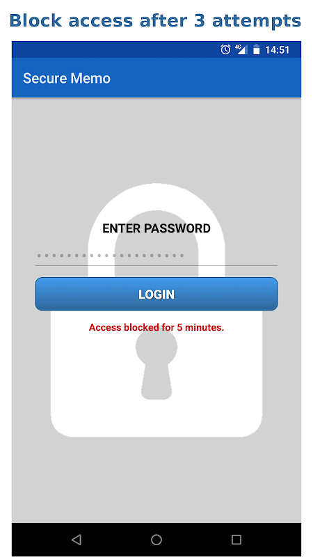 بعد 3 محاولات فاشلة لتسجيل الدخول، يتم حظر التطبيق لمدة 5 دقائق لأسباب أمنية ومخازن التاريخ والوقت من محاولة الوصول غير المصرح به. عند صاحب الجهاز يدخل في وقت لاحق في التطبيق سيتم عرض رسالة تشير إلى تاريخ ووقت ومحاولة الوصول.
