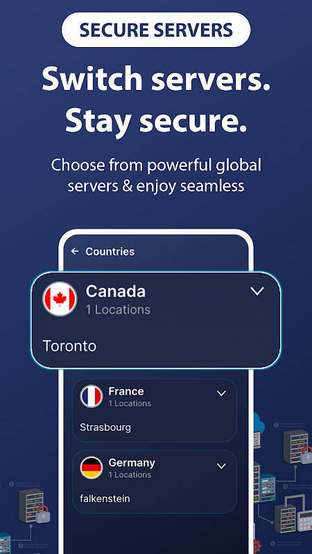 • Global VPN Servers: Switch between VPN USA, UK, Canada, and more for maximum speed and stability.