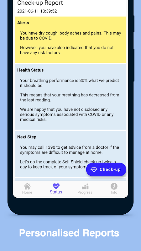 Self Shield is an App that can support you keep track of your health and protect both yourself as well as others. It uses advance AI based analytics to assess the symptoms that you disclose, existing medical conditions, your state of breathing and other data to determine your health and keep track of your progress. This will allow you to identify a deterioration in your health early and seek medical advise.