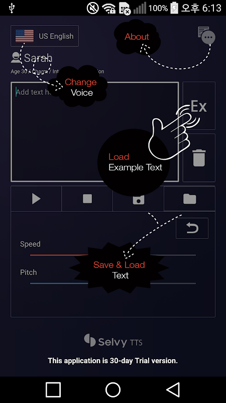 ** Selvy TTS هو متاح في التطبيق محاكمة، وهي متاحة لمدة 30 يوما بعد التثبيت.
