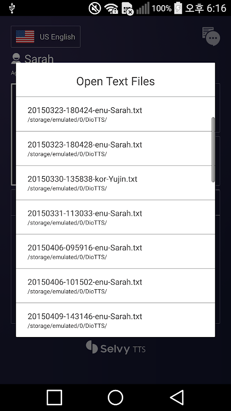 يساعد Selvy TTS عندما قال لتحويل النص الذي تم إدخاله على الهاتف الذكي الخاص بك في الصوت أكثر طبيعية في أي مكان!