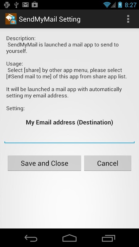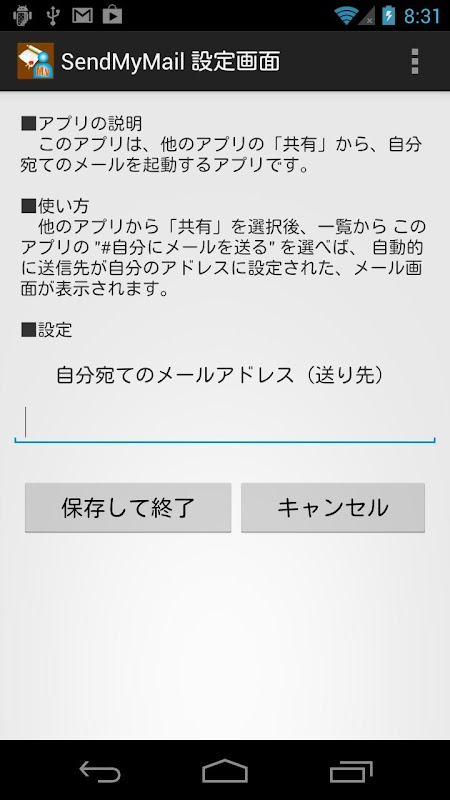 Select [share] by other app menu, please select [#Send mail to me] of this app from share app list.