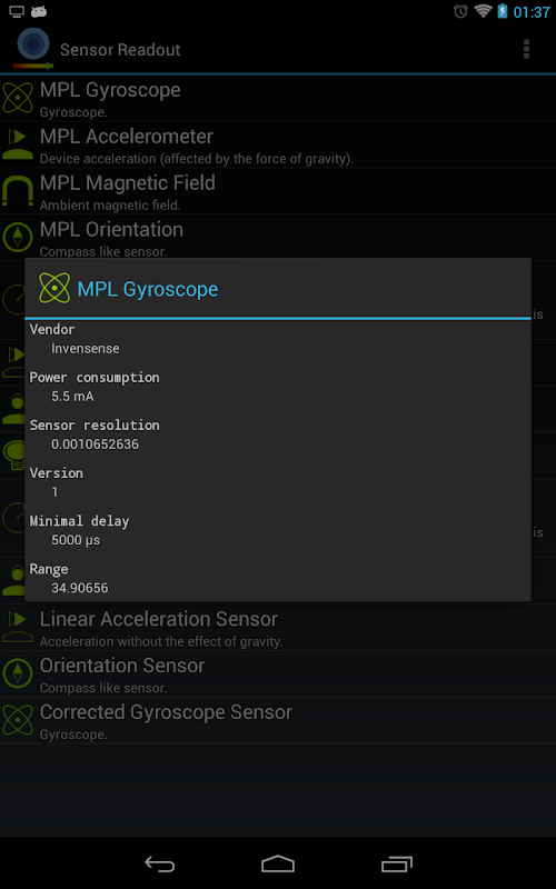 * Touch desired sensor on the list screen in order to start the readout. Long touch the sensor to show it's details. Use "Back" to close the details dialog again.