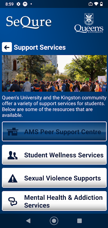 SeQure هو التطبيق سلامة الرسمي للجامعة كوينز. هذا هو التطبيق الوحيد الذي يتكامل مع أنظمة السلامة والأمن جامعة كوينز ل. عملت الحرم الجامعي الفريق العامل السلامة الملكة لتطوير التطبيق الفريد الذي يوفر للطلاب وأعضاء هيئة التدريس والموظفين مع السلامة المضافة على حرم جامعة الملكة. فإن التطبيق يرسل لك تنبيهات هامة تتعلق بالسلامة، وتوفير إمكانية الوصول الفوري إلى موارد الأمان داخل الحرم الجامعي.