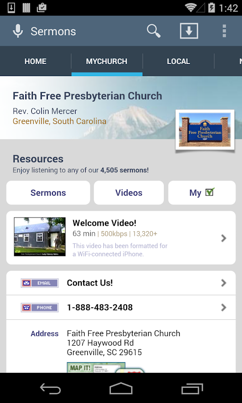 Elegantly browse and search through the world's largest library of free audio + video sermons from thousands of different speakers and stream or download immediately on your Android device! In addition to finding good sermons, you can find faithful churches in your area or while away from home using our handy “Local Church Finder” by typing in your ZIP code or partial city name.