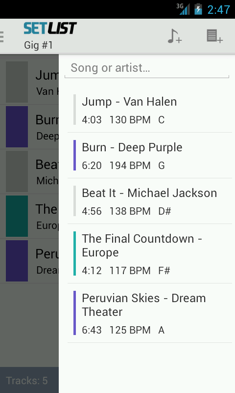 Setlist هو التطبيق المثالي لمساعدتك في إدارة القوائم مجموعة الخاصة بك! لديك لإعداد أزعج المقبل الفرقة الخاصة بك؟ هل أنت DJ وكان لديك لتحديد المسارات الحق في جعل أصدقائك الرقص طوال الليل؟ Setlist يجعل كل شيء سريع للغاية ومريحة!