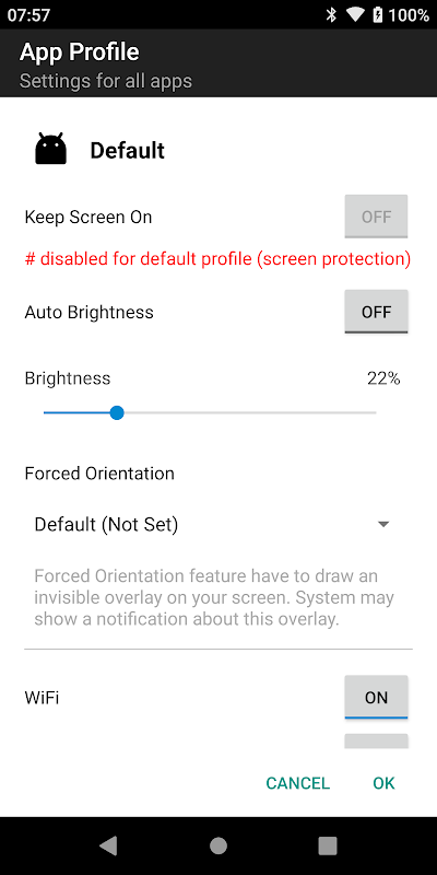 Different apps need different configurations and settings. This app help you to switch to different set of settings for your each of your app individually. It includes volume, orientation, network conditions, Bluetooth connection, screen brightness, keep screen awake, etc.