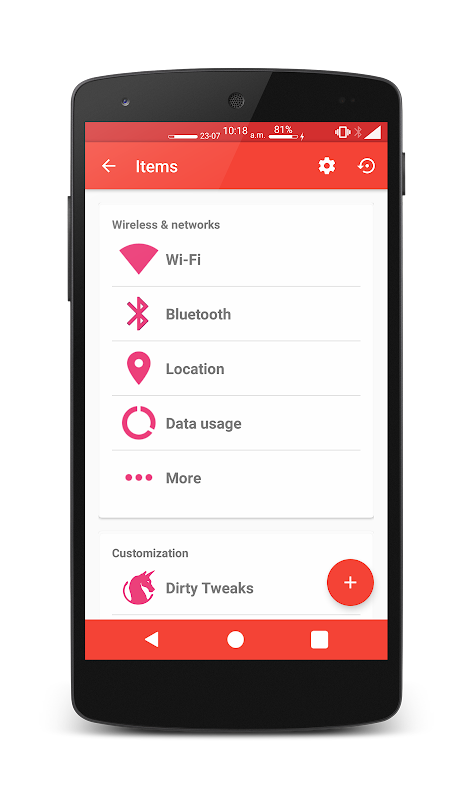 عن إطلاق أول هذا التطبيق سوف تحصل على قائمة بجميع البنود الإعدادات. يمكنك إضافة واحدة ببساطة عن طريق النقر على زر زائد. يمكنك إزالة عنصر عن طريق الضغط عليه لفترة طويلة أو تعديل واحد من خلال النقر عليه. يمكنك تغيير الاسم، فئة، رمز والتطبيق / قطعة لإطلاق. يمكنك أيضا تغيير ترتيب العناصر والفئات.