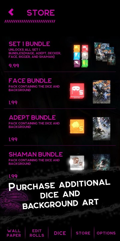 عندما تشتري زهرًا يتجاوز العينة المجانية ، تحصل على قطعة مرافقة من فن Shadowrun يمكن استخدامها كخلفية للتطبيق.