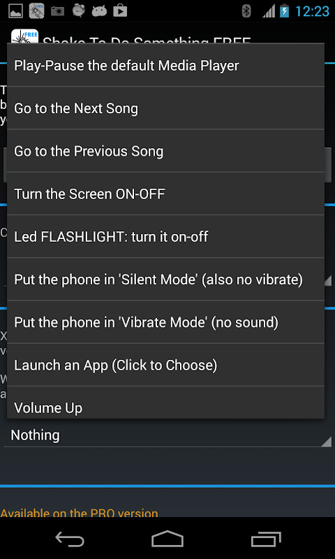 لسوء الحظ ، لن يتمكن التطبيق في بعض الأجهزة من إطلاق الإجراءات عندما يهز المستخدم الهاتف بعد إيقاف تشغيل الشاشة. إنها قيود على الأجهزة لهذه الأجهزة ، ولا يوجد شيء يمكن القيام به على جانب البرنامج لتجنب ذلك. على سبيل المثال ، لقد اختبرت التطبيق على "LG Nexus 4" وهو يعمل بشكل لا تشوبه شائبة ؛ من ناحية أخرى ، في "Samsung Galaxy Ace" ، يتم إيقاف تشغيل مستشعرات مقياس السرعة في اللحظة التي تنطفئ فيها الشاشة. إذا كان هذا هو الحال على جهازك ، فالرجاء إرسال بريد إلكتروني إلي (يوجد زر في التطبيق للقيام بذلك) لشرح ما يحدث في حالتك المحددة.