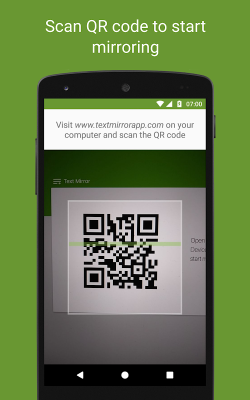 مجرد فتح https://www.textmirrorapp.com على جهازك عن بعد، وبدء عملية النص يعكس على جهاز الروبوت الخاص بك، مسح رمز الاستجابة السريعة والنسخ المتطابق يبدأ على الفور. بهذه البساطة. ليس هناك حاجة إلى برامج إضافية على الجهاز الهدف.