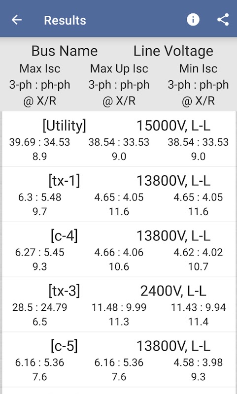 اضغط على زر "تشغيل التحليل" لحساب قيم تيار الدائرة القصيرة المتوفرة من 3 مراحل ومن مرحلة إلى مرحلة ونسبة الخطأ X/R في كل شريط توصيل.