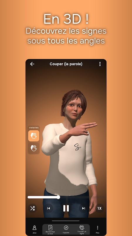 اكتشف Sign3D، أول قاموس LSF على هاتف ذكي مع صورة رمزية ثلاثية الأبعاد لمزيد من التفاعل! مع أكثر من 5000 علامة تم التحقق منها، تعال واكتشف LSF، وقم بإثراء مفرداتك حسب الأخبار أو رغباتك. يدعمك Sign3D بشكل يومي بكل سهولة.