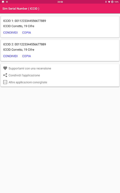 الرقم التسلسلي لشريحة Sim ، وهو تطبيق بسيط لقراءة رمز ICCID الذي يتم كتابته عادةً على الجزء الخلفي من بطاقة sim ، غالبًا ما يحدث أن يتم قطع هذا (للتمرير إلى micro sim على سبيل المثال) أو أنه لسبب أو لآخر لم يعد قابلاً للقراءة ، وهنا يأتي تطبيق Sim Serial Number ، وهو تطبيق يسمح لك بقراءة الرمز من Sim الخاص بك دون الحاجة حتى إلى إزالته من الهاتف ، بنقرة واحدة فقط ، وإذا كنت بحاجة إلى توصيله إلى شخص ما ، فيمكنك "مشاركة" و " نسخ "حق لك!