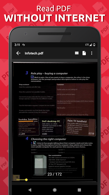 يتعرف قارئ PDF تلقائيًا على جميع المستندات المخزنة على جهازك. سينشئ القارئ قائمة بملفات pdf وستحتاج فقط إلى تحديد المستند المطلوب لعرضه.