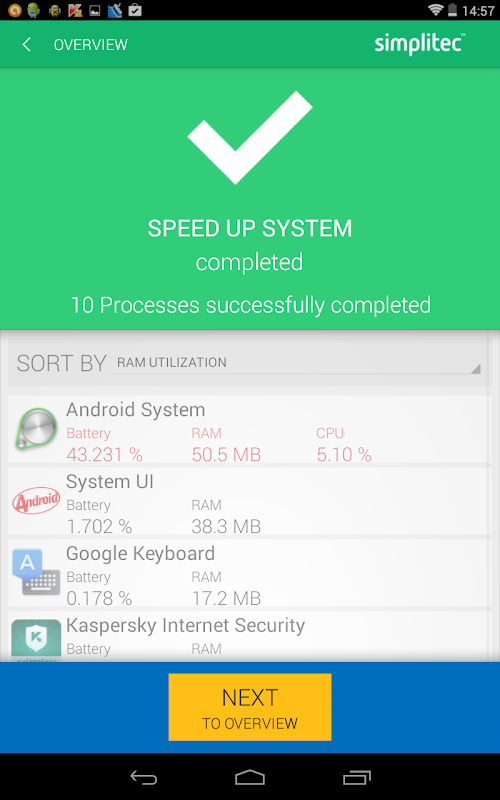 Put an end to excessive battery use! simpli Clean identifies and disables high-consumption apps, giving you more battery life and allowing you to use your phone or tablet even longer.