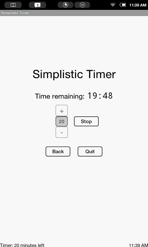 Originally designed for the Barnes & Noble Nook Touch e-reader, which lacks sound and vibrations, this application provides a countdown timer with pop-up notification messages and configurable onscreen clocks (see the bottom of the screenshots).