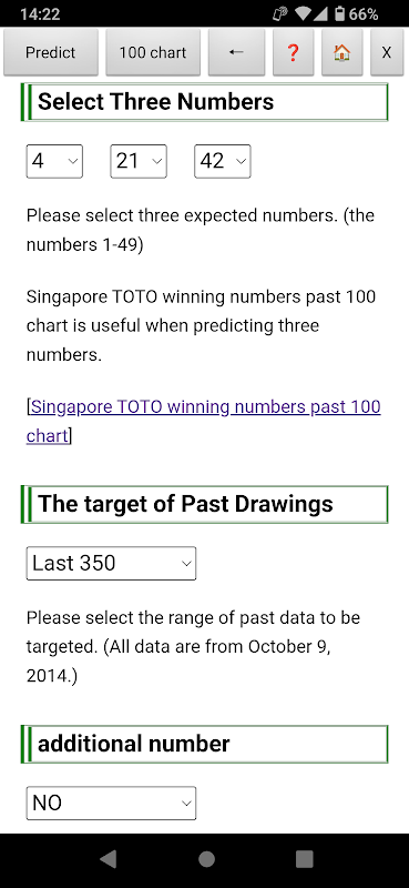 هذا البرنامج ليس برنامج تنبؤ مثالي لأنه يتعين عليك التنبؤ بالأرقام الثلاثة بنفسك باستخدام "الأرقام الفائزة في سنغافورة TOTO بعد 100 مخطط".