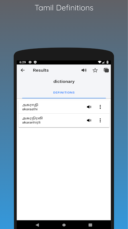 * تعريفات التاميل: اكتشف ترجمات مفصلة لأكثر من 300000 كلمة إنجليزية باللغة التاميلية.