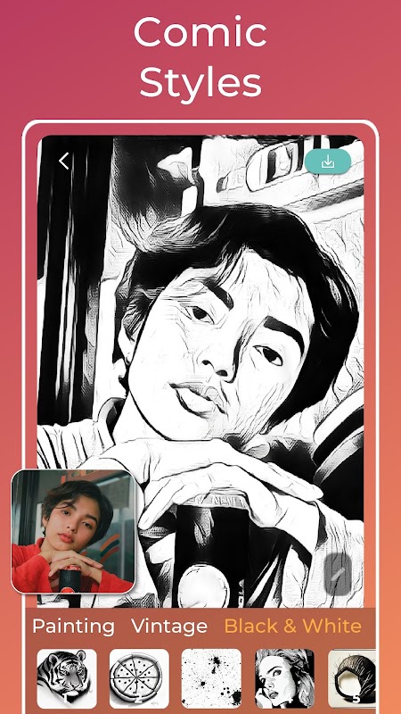 - محرر الصور الأبيض والأسود: قم بتحويل الصور إلى فن أحادي اللون. وأعزز ملامح رسمك بواسطة محرر الخطوط المتكامل لدينا لإضافة عمق ودراما.