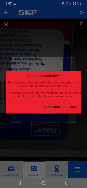 نتيجة المسح "نجح المسح - الرمز صالح" هي إشارة ، ولكنها ليست ضمانًا ، أن المنتج أصلي. قم دائمًا بإرسال الصور باستخدام تطبيق SKF Authenticate إذا كنت بحاجة إلى تحقق.