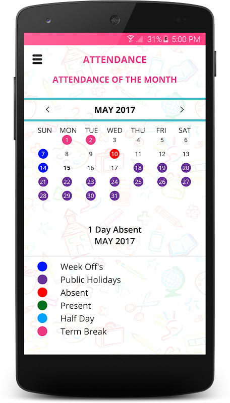 - يوفر هذا البرنامج المتطور تذكيرات وإعلامات ومشاركة الصور ومقاطع الفيديو الخاصة بالفعاليات الخاصة التي تقام في المدارس مثل المهرجانات والرياضة وكرنفال وبرامج يوم الطفل وما إلى ذلك.